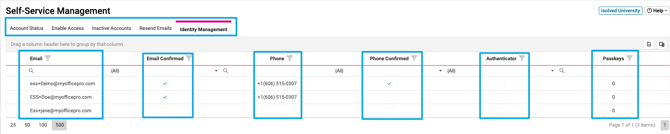 The Self-Service Management screen in iSolved allows Client Users (employers) to see Account Status, Enable Access, Identity Management, and see inactive accounts for multiple employees.